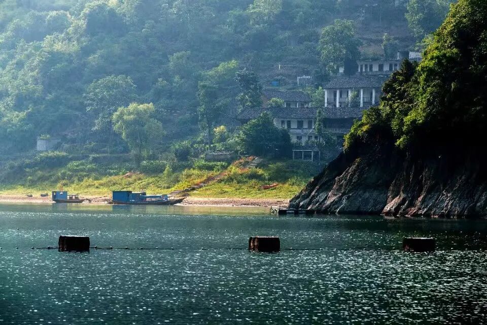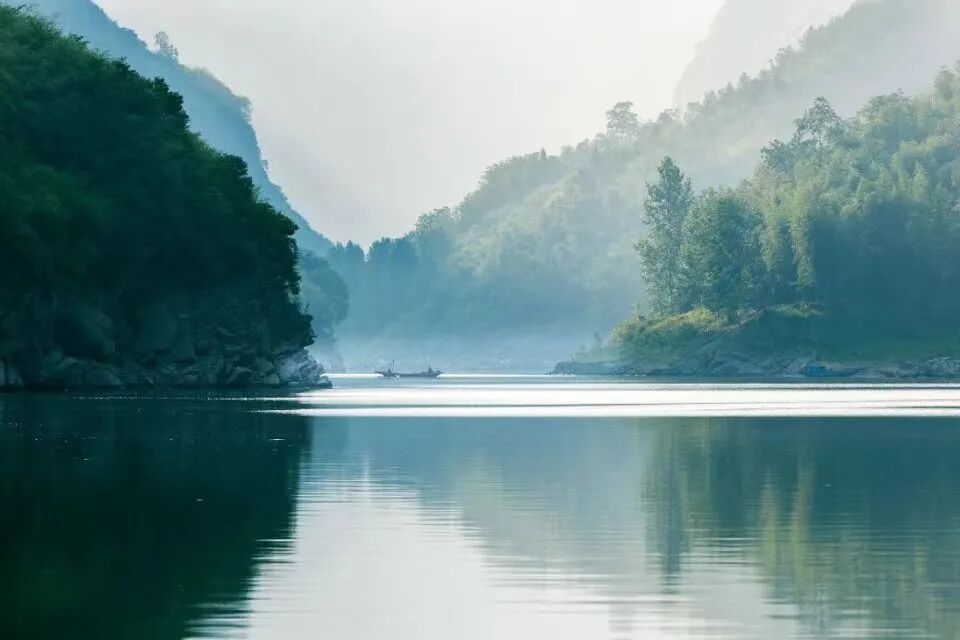 这里一切都是自然而又原始的姿态,四季峰峦间缠绕着迷雾,水面倒映着山影树影,渔船悠然而过,一派清新怡然自在的景象。